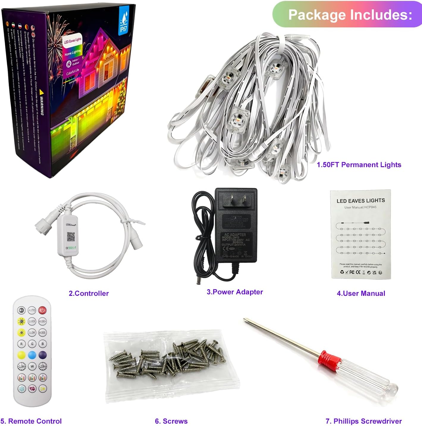 | Included Components | 1pc Instruction, 1pc Lighting Installation Kit, 1pc Power Adapter, 1pc Remote Control, 50ft permanent outdoor lights with 18 RGB+IC led lights |
